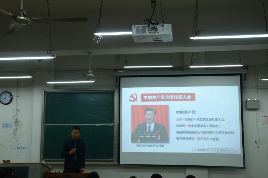 首先,甄诚老师简洁准确地向同学们介绍了党的历届代表大会召开的时间及意义,并最终落脚于刚刚结束的中国共产党第十九次全国代表大会,与同学们分享了学习十九大报告的体会并从身边生活的变化了对社会主要矛盾发生变化的理解。