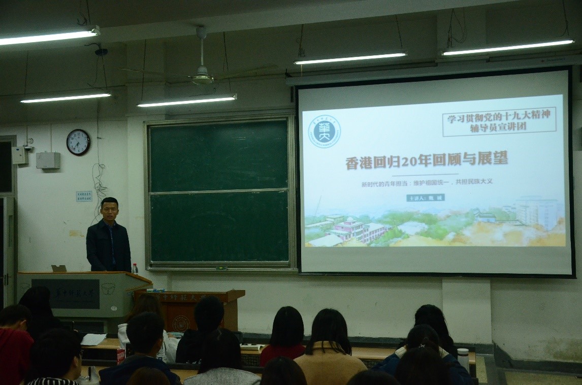 此次讲座以华中师范大学学习贯彻党的十九大精神进班团为背景,旨在强化大学生勇于担当的使命感,责任感。甄诚老师以香港回归20年回顾与展望为题,带同学们回顾了香港回归之前的屈辱史,为同学们介绍了香港回归后20年间的社会发展,民生百态,最后勉励全体学生,敢于担当,坚决维护国家统一,做勇当担任的新青年。