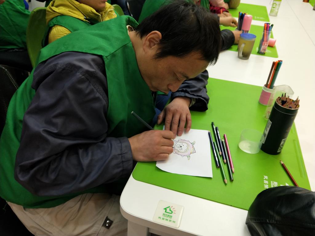接着,是一个涂色的小游戏。志愿者们把事先准备好的“喜羊羊与灰太狼”系列涂色卡分发给服务对象们,就站在他们身边,鼓励他们按照自己的喜好给“羊羊们”涂上不同的颜色。有一些服务对象似乎对配色颇有研究,涂好的作品十分可爱。志愿者们的耐心、温柔与服务对象们的欢乐、嬉笑让整个教室格外的温暖。