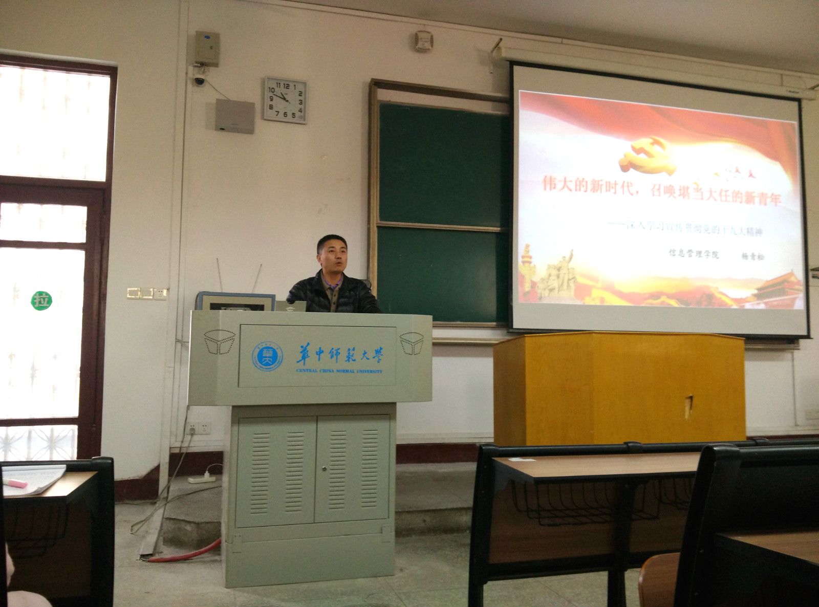 11月30日下午2:30,四院发展对象联合培训班(第二期)对来自各个学院的党员发展对象开始了为期一个半小时的思想培训,我院副书记杨青松在会上发表了题为《伟大的时代,召唤堪当大任的新青年》的讲话,分享了学习十九大的心得体会,并提出对大学生党员的期望与建议。