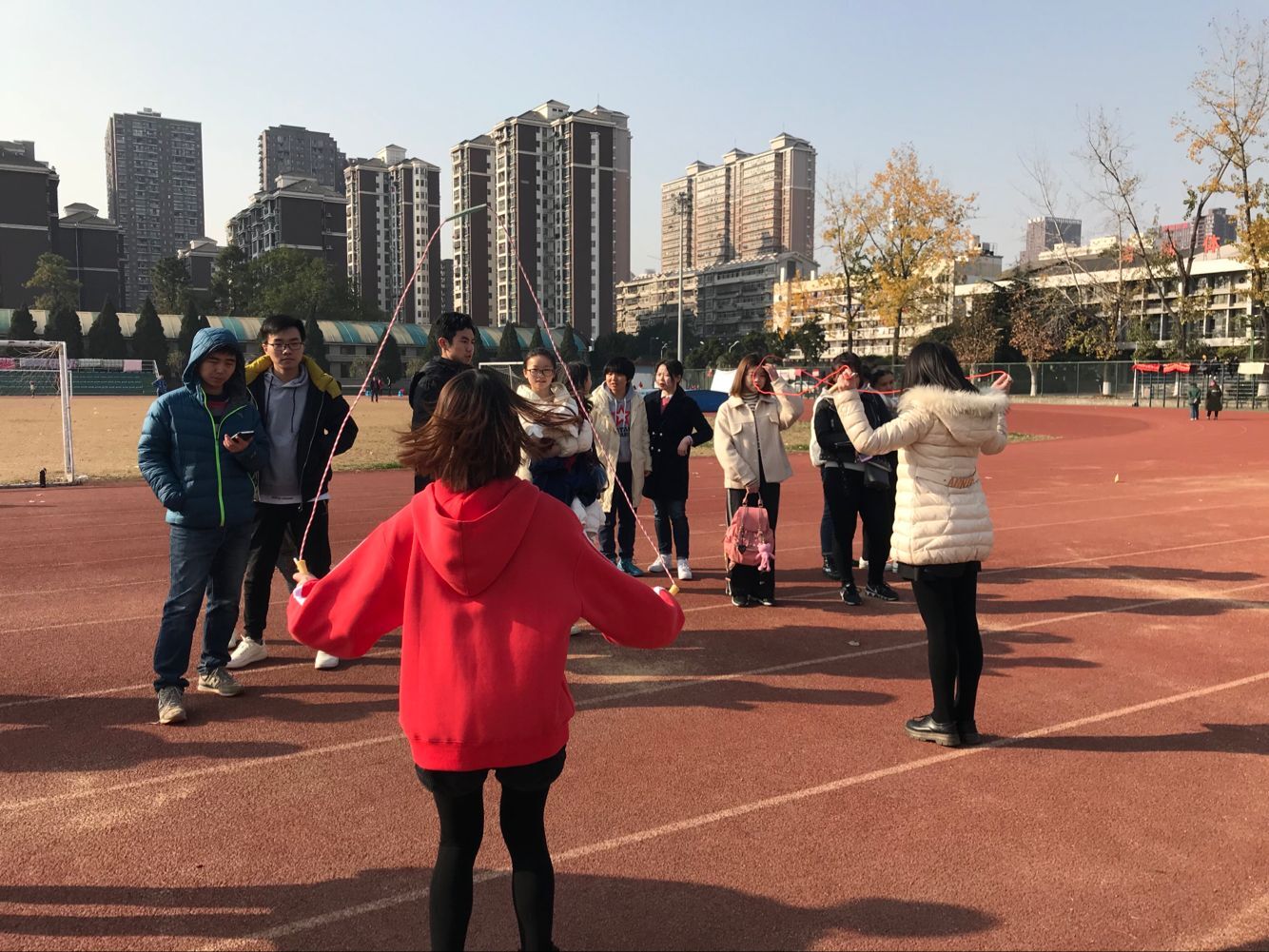 教室里静如处子,操场上动如脱兔。为了调动同学们的运动积极性,12月17号下午2点信息管理学院联合外国语学院、教育学院等五个学院,在南湖操场举办了一场精彩绝伦的跳绳友谊赛,数十位同学参加了比赛。