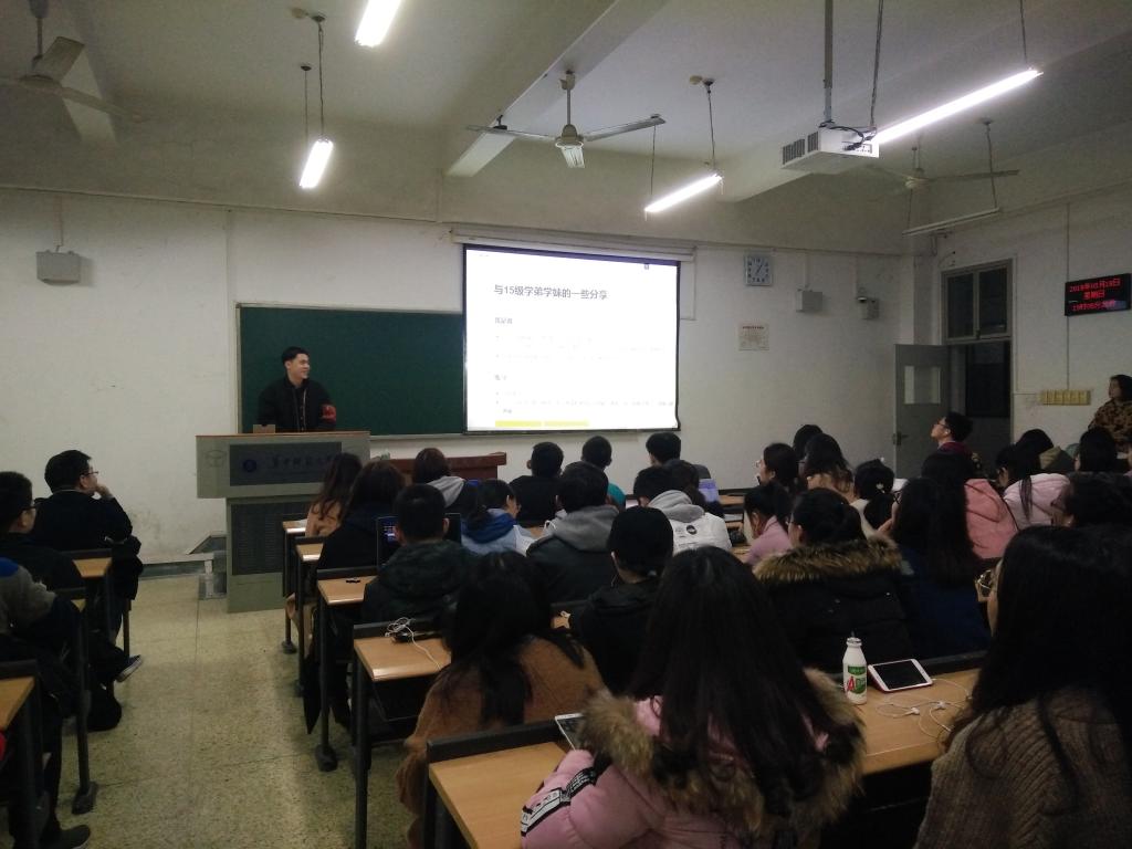 (通讯员:张紫西)3月18日晚7点,信息管理学院15级在8303教室举办了信息管理学院求职经验分享会,到场嘉宾有信息管理学院团委书记兼15级辅导员蒋可鸣老师。分享会在蒋可鸣老师主持下,由14级杨帆和刘咏伦给同学们进行了互联网技术和产品经理岗位相关的就业指导与经验分享。