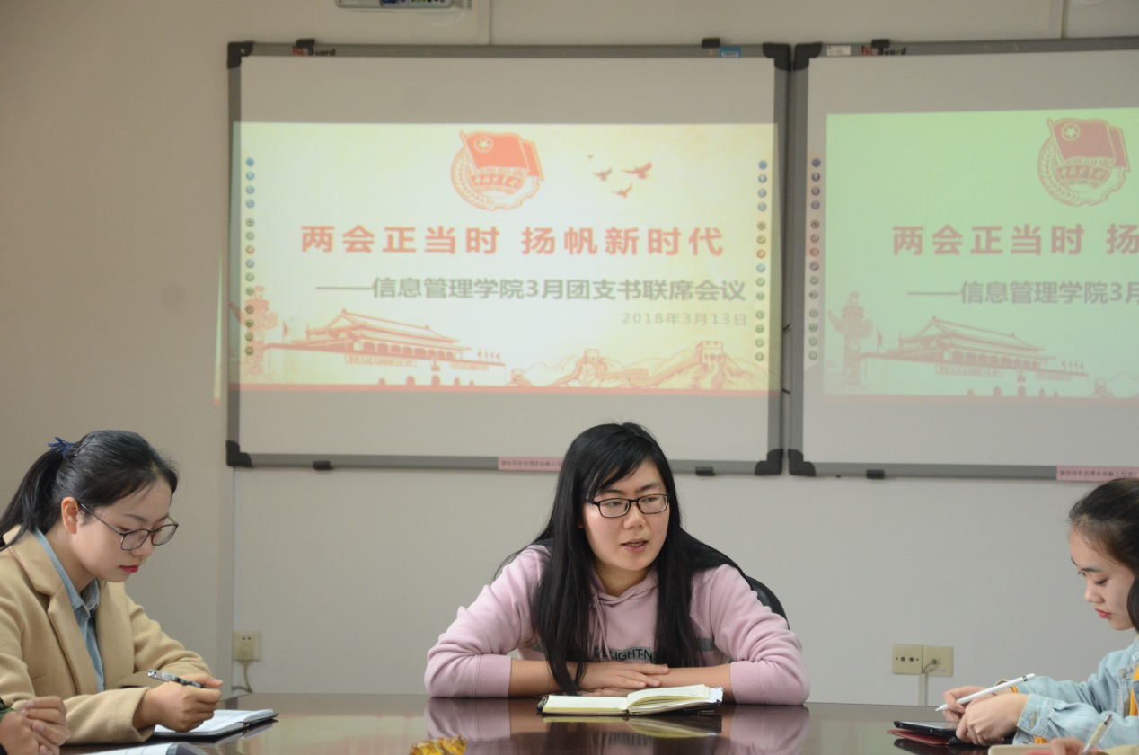 会议伊始,蒋可鸣首先回顾了去年召开的十九大,接着联系到正在召开的两会进行了发言。她提出作为团学干部,应该深入透彻的学习其中的精神,并将其运用在团学工作当中。作为一名团学干部,应该具有正向精神,并将这种精神传递给身边的其他同学。各团支部在举办团日活动的时候应该注意要让同学们有获得感和参与感,与同学们共同成长。