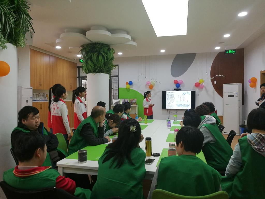 新来的三位志愿者一一做自我介绍后,志愿者魏锦钰开始讲解清明节的由来和风俗习惯。大家都听得非常认真,积极回答魏锦钰提出的问题。然后,魏锦钰转入了诗词学习,她带领残疾人朋友朗读了《清明》一诗。在志愿者们的鼓励下,一位残疾人朋友站大胆地起来背了这首诗,大家都报以热烈的掌声。在欣赏了这首七言绝句后,魏锦钰给大家播放了关于清明节风俗的小视频,让残疾人朋友加深对清明风俗的印象。
