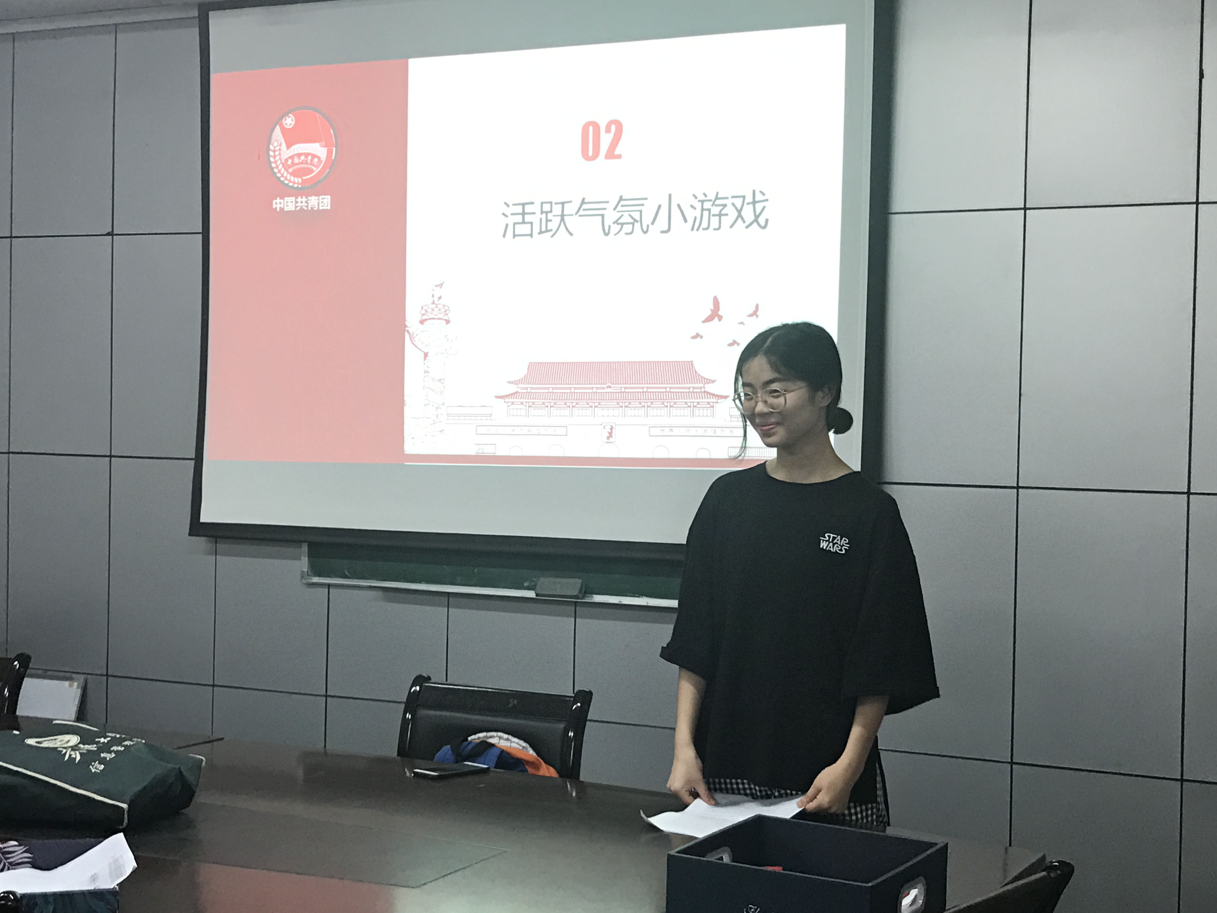 接下来,团支书谭长芝播放了《入团第一课》、《入团仪式示范片》、《习主席在北大的讲话之同学们怎么看》等一系列视频,带领大家回顾了入团时的场景,并在观看完视频后,为支部成员发放了团徽,讲解了有关五四精神以及习总书记在北大讲话中的重要内容。谭长芝说:“五四运动促进了马克思主义在中国的传播,其与工人运动相结合的方式,在思想上和组织上为中国共产党的建立准备了充足的条件。转眼间,已走过了九十八个春秋,五四运动走进了记忆,也留在了历史,敢为人先的五四精神值得每个国人学习。看完这些视频,相信大家也对此有了更深的感悟,作为当代大学生,我们需要努力学习,不负每一段时间,去完善和改变自己,向着目标不断进取,真正从思想上加入到团的组织中去,以实现自己的入团誓言。”赢得了大家热烈的掌声。