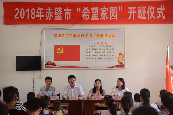 7月4日上午,华中师范大学信息管理学院追光实践队赤壁分队全体队员,在赤壁市赵李桥镇羊楼洞村党员群众服务中心党员活动室,参加2018年赤壁市“希望家园”开班仪式。赤壁市团委书记蒋文玲,赵李桥镇党委副书记、镇长方治,华中师范大学信息管理学院本科生辅导员肖丽霞出席本次开班仪式,“希望家园”的学员们及其家长到场参加,仪式由赵李桥镇党委副书记周乐军主持。