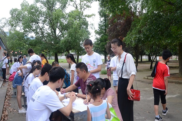 报名开始后,孩子们在家长的带领下陆续进入学校,负责报名接待的队员们耐心解答学生和家长的疑问,并指导他们完成报名表和安全承诺书的签写。根据报名学生年龄层次的不同,实践队员大致将学生分为四个大班,一二年级为一班,三四年级为二班,五年级为三班,五年级以上为四班。追光实践队队员当起了班主任,报名成功的学生在班主任的带领下依次进入相对应的班级,教室里的学生人数也逐渐增加,达到了120人。