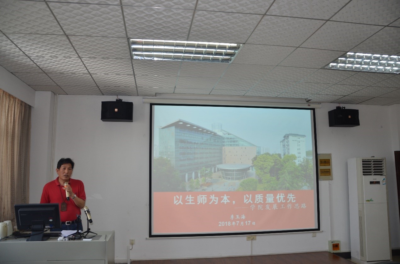 李玉海院长首先向全体教职工作题为“以生师为本,以质量为先——学院发展工作思路”的工作汇报。李院长从人才培养、科学研究、队伍建设、学科建设和国际合作等五个方面对学院“十三五”规划目标和当前执行情况进行了回顾和总结,进一步厘清思路、找准问题,明确了包括学科专业发展不平衡,缺乏专业领军人物,师资队伍规模偏小等影响未来学院发展的主要问题。为圆满完成“十三五”规划目标,推动学院事业发展迈向新台阶,李院长最后从“学科、学者、学生和学费”四个方面提出了学院未来发展的总体思路。