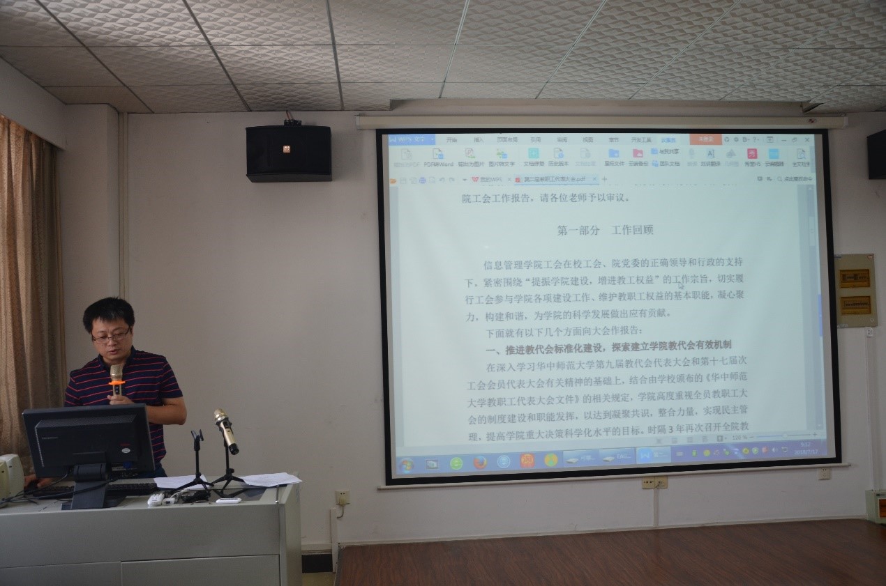 会议第二项,工会主席胡潜作工会工作报告。胡主席首先对近两年的工会工作进行了全面回顾。在过去近两年里,一方面,学院工会高度关注民生工作,积极打造“信管教师之家”,帮助教职工子女上学登记、组织全院师生开展救助扶贫活动等。另一方面,为了丰富广大教职工的业余生活,积极组织大家参与校运动会、校羽毛球比赛等文体活动,为青年教师搭建互助学习平台,进一步增强了集体的凝聚力。最后,胡主席对未来工作进行了展望,表明未来将进一步落实全体教职工大会的监督评议作用,加强工会队伍建设,更好服务全院教职工。