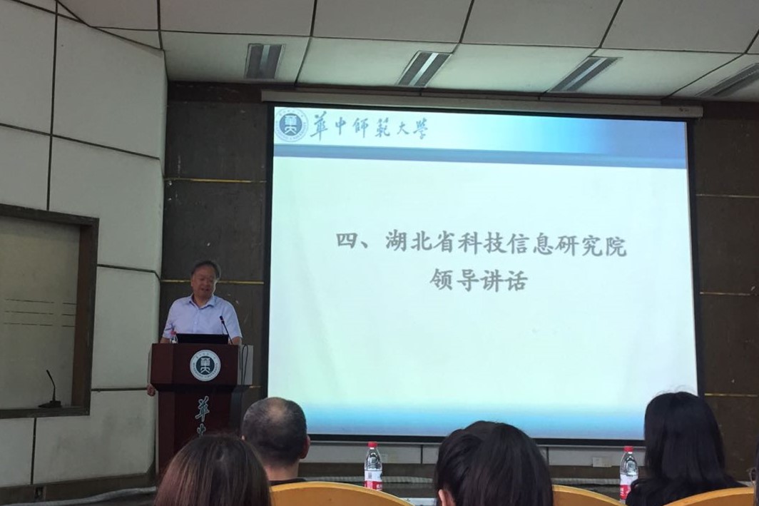 紧接着,湖北省科技信息研究院代表致辞。湖北省科技信息研究院的前身为湖北省科学技术情报研究所,成立于1958年9月,根据国务院统一规划部署,承担建设全国区域科技情报中心的任务,并于2001年更名为湖北省科学技术信息研究院。此院拥有资深科研队伍,全院各类人员210余人,其中硕博学历人员100余人,在职人员中专业技术人员占90%以上,高中级专业技术人员的比例达到70%以上。拥有享受国务院政府特殊津贴专家、省劳动模范、省有突出贡献中青年专家、省政府专项津贴专家、省跨世纪“111人才工程”人选专家、二三级专业技术岗位正高级专家等近20人。黎教授不仅对科技信息研究院的建设发展进行了详尽介绍,还向研究生新生们抛出橄榄枝,期待大家的加入。