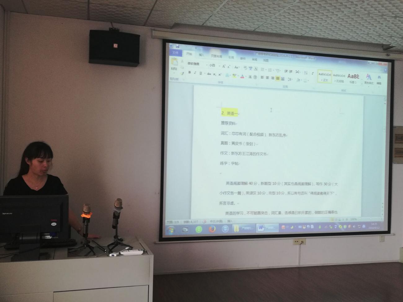 本科就读于华中师范大学的严婷婷学姐作为第一个分享者,主要讲述了自己的英语和专业课复习心得。她以时间轴为切入点,从自身经验出发,分别讲述了自己在各个时间段对各个题型的练习和理解情况。谈到考研和高考的区别时,她讲到“考研好比摸黑洗衣服,考场灯亮前永远不知道还有哪里没洗干净”,她也以此劝诫同学们把握每分每秒,尽力多做准备。专业课复习中她强调把握课本框架,并认为老师的出卷重点一定是之前课堂上提及较多的点,“有条件的话可以去跟大一同学一起再上一次课”。