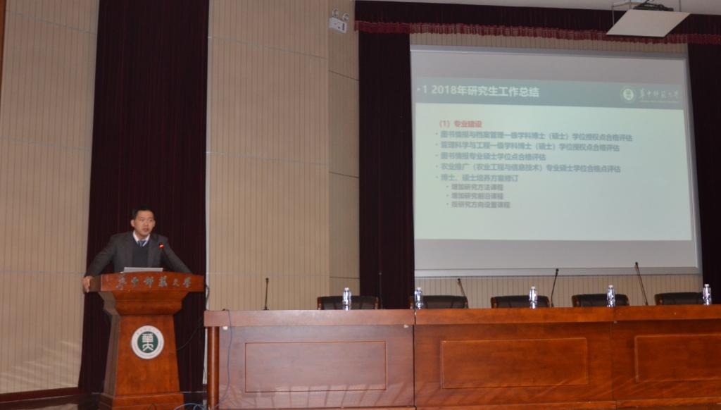 (通讯员牟奇蕾)信息管理学院于2018年12月27日下午2:00在科学会堂一楼报告厅召开了主题为“新时代,新要求,新作为”的全体研究生会议。会议旨在弘扬“立德树人”的师风,倡导“孜孜不倦”的学风和培养“求真务实”的作风,同时对学院本年度研究生工作作出系列总结和展望。出席大会的领导与嘉宾有:华中师范大学研究生工作部副部长徐刚,信息管理学院党委书记汪继平,信息管理学院院长李玉海,华中师范大学校团委副书记麻旎,信息管理学院副院长曹高辉,中国农村研究院2017级硕士研究生、校研究生会主席冯旺雄,以及信息管理学院教师代表。