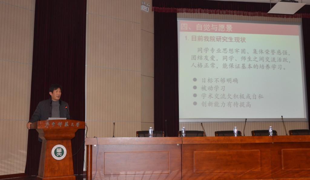信息管理学院李玉海院长登台作出了关于研究生培养工作的报告。李院长紧紧围绕“勤学苦练,争当优秀的新时代社会主义建设者和接班人”展开,将报告的内容分为:当前面临的形式和机遇、我院基本情况、我院办学思路及抓手、自觉与愿景这四个部分,从学院学科专业、教师队伍、学生规模和研究平台四个方面概述了我院基本情况。报告最后李院长对全院研究生提出了“给学院加分而不是减分,给学弟学妹开路而不是添堵”的美好愿景,同学们深受激励,铭记在心。