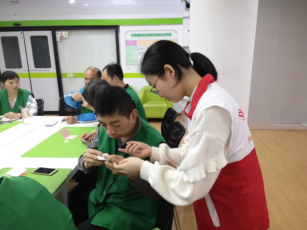 随后,志愿者们开始教授残疾人朋友们做有关感恩母亲的手工贺卡。首先,志愿者先在讲台上统一讲述大致步骤。接着,残疾人朋友们开始动手制作。本次教学采用“一对多”的模式,残疾人朋友们遇到不会的步骤时,志愿者上前解答。一位残疾人朋友不会折贺卡中间的花朵,志愿者重新拿了一张纸,耐心地为残疾人朋友重复步骤。志愿者重复折纸步骤后,还会在残疾人朋友身旁等待,看残疾人朋友自己动手,直到确保残疾人朋友学会后才离开。在大家的共同努力下,残疾人朋友们全部完成了感恩母亲的手工贺卡制作。本次志愿活动结束,大家合影留念。