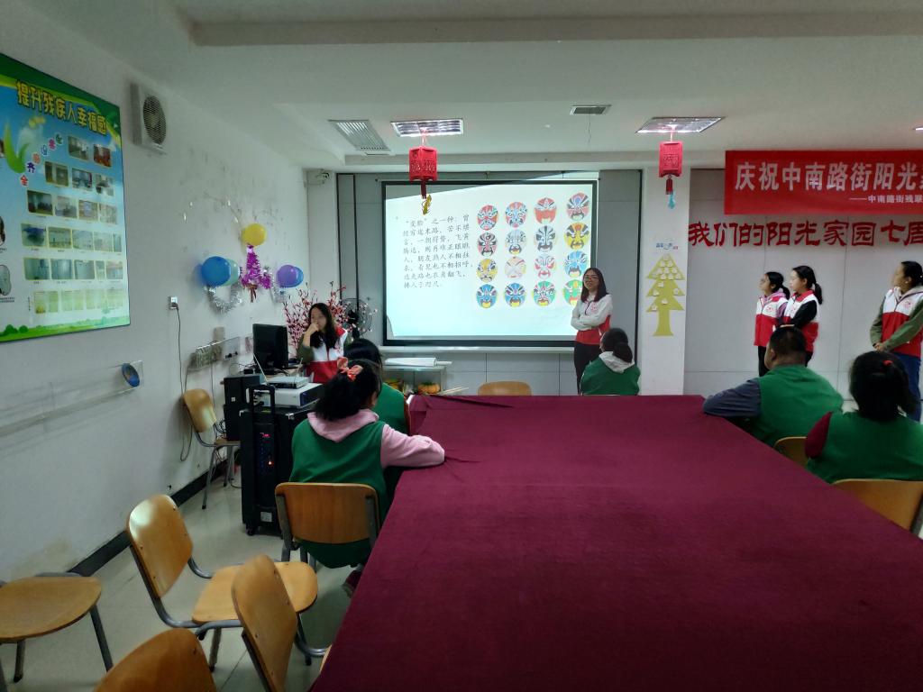 志愿者们到达中南路阳光家园后,经过10分钟的准备。14:30,在活动大厅,准时开始今天的志愿活动。一部川剧变脸的短片,将残疾友人们从刚刚的睡梦中拉了回来,他们顿时对变脸,以及其中表演的喷火产生了兴趣,志愿者在一旁暖心提醒到"危险动作,请勿模仿"。在看到变成白脸的表演者向观众递飞吻时,他们脸上展出灿烂可爱的笑颜,这使气氛变得活跃起来。