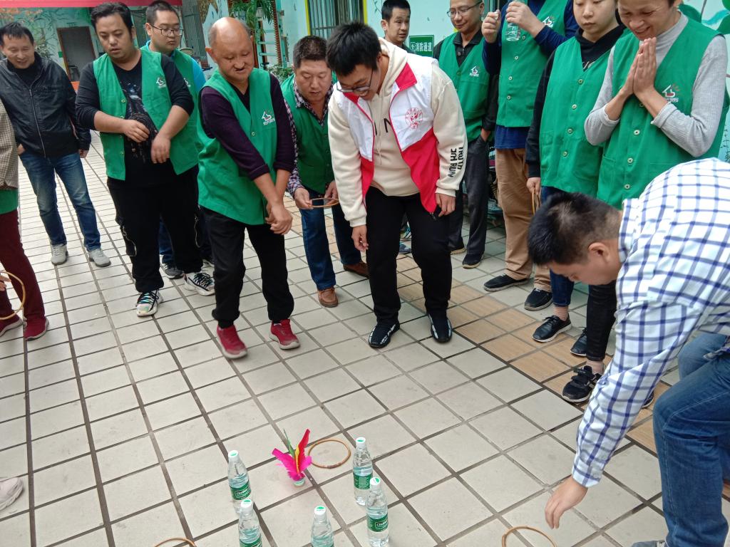 PPT放映完毕,所有人来到室外进行两项互动小游戏,分别为击鼓传花和套圈夺宝。击鼓传花的游戏进行了三轮,并都是“花落”志愿者,两名志愿者演唱了爱国歌曲,一名志愿者则带来了花式踢毽子表演,残疾人朋友们一同为其数数。在套圈夺宝的游戏中,残疾人朋友的积极性都很高,积极参与。活动的尾声,残疾人朋友共同演唱了多首歌曲,最后以手语《感恩的心》作结,大家一起合影留念。