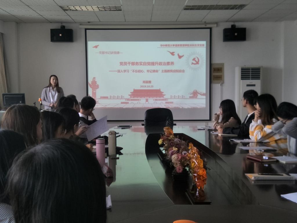 (通讯员 武晓红 张顺顺)2019年10月25日,中共华中师范大学信息管理学院本科生党支部于学院918会议室顺利开展信息管理学院本科生党支部“支部书记讲党课”活动,本次会议由支部书记肖丽霞同志主持。