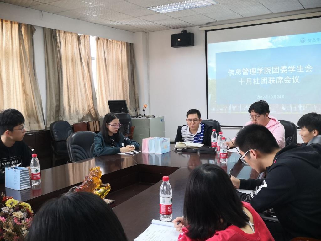(通讯员 谭艳卉 徐亚星)为规范社团发展,助力社团招新,10月24日,信息管理学院十月社团联席会议在九号楼九楼918会议室举行信息管理学院团委书记、16级辅导员穆帆、校社团联合会爱心公益部兼艺术创意部部长曲建钢、信息管理学院社团联合部部长倪嘉蔚及各社团负责人出席本次会议。会议由倪嘉蔚主持。