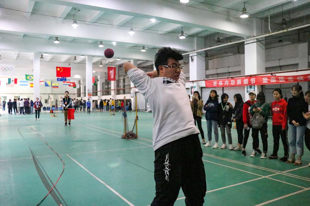 比赛开始,由信息管理学院女将打头阵,她们个个满怀必胜的信念,拿出“谁说女子不如男”气势。男生紧随其后,以惊人的爆发力赢得场上的阵阵欢呼与喝彩。赛场上,信管选手们以团结的精神和不甘示弱的毅力尝试突破极限,个个表现出色。“双脚开立、双手持球、两腿下蹲、上身迅速抬起”,他们牢记动作要领,奋力抛球,一道道完美的弧线展现出了他们的实力。场上的阵阵欢呼雀跃是他们优秀的证明。