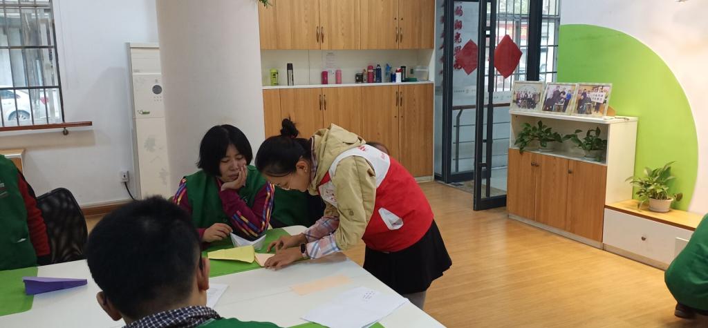 接下来便是折纸飞机的环节了。当面对五颜六色的彩纸,残疾人朋友们显得格外的高兴,争先恐后地挑选了自己喜欢的颜色,然后叠了起来。他们对纸飞机的熟悉与热爱,让志愿者们一度不知该如何从旁协助。后来,志愿者们在一旁帮忙捡纸飞机,残疾人朋友们在肆意地玩着纸飞机,所有人脸上都洋溢着灿烂的笑容。伴随着欢笑声,今天的志愿活动结束了。