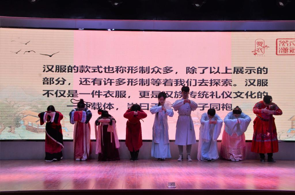 伴随着古色古香的音乐,卿衣汉服社则带来的古装走秀依次展示了晋、汉、唐、宋、明的经典服饰。晋制襦裙妖娆明媚,汉绕襟袍庄雅高贵,唐袍圆领简约大美,宋襟百迭幽婉清新,明代袄裙明亮艳丽。这些形制众多、各具特色的服饰让同学们见识了古代服饰的精致美丽,同时初步了解中了国服饰数千年来的的发