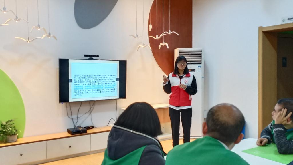 志愿者们来到阳光家园时,残疾人朋友们正在为活动做准备。活动开始,先由志愿者郭明丽和陈万琪向残疾人朋友们介绍美国总统林肯的生平事迹及其所宣扬的平等精神。接着,便到了大家最期待的游戏环节了。这个游戏是“拍七”,即当自己报到七的倍数或含七的数字时就要拍手,做错了就要表演节目。其中的一位残疾人朋友对游戏规则十分清楚,因此她几乎全程都在帮志愿者们指导和纠正其他的小伙伴们。一会儿对这个说:“你要拍手”,一会儿又纠正那个道:“不是,你这个不要拍”。结果到后来数字渐渐变大时,她也犯了错,被志愿者们提醒道:“91也是7的倍数啊”。于是,她只好站起来唱了首歌。残疾人朋友们做错了动作之后,有的模仿了蝴蝶飞舞的动作,有的背了首诗,有的就像那位朋友一样唱了首歌,最后还带动了全体残疾人朋友们一起合唱,整体气氛非常欢乐。