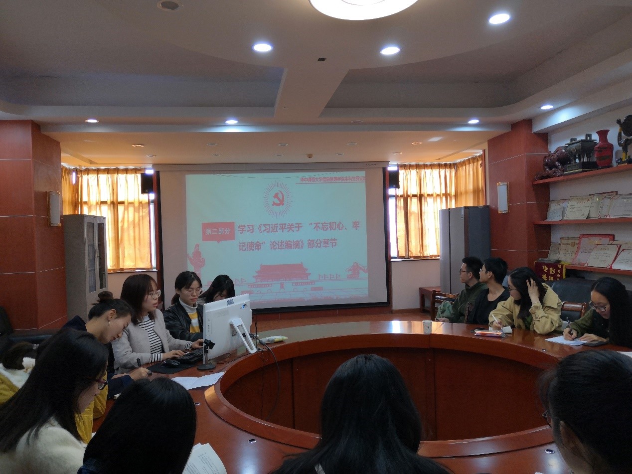 会议第二项,全体党支部同学共同学习了《习近平关于“不忘初心、牢记使命”论述编摘》部分章节内容。支部书记肖丽霞指出,“不忘初心、牢记使命”是我们党在新时代发出的伟大号召,作为党员要在持续深入学习实践中坚定信仰、增强党性、提高素质,与党一起为实现中国梦拼搏奋斗!