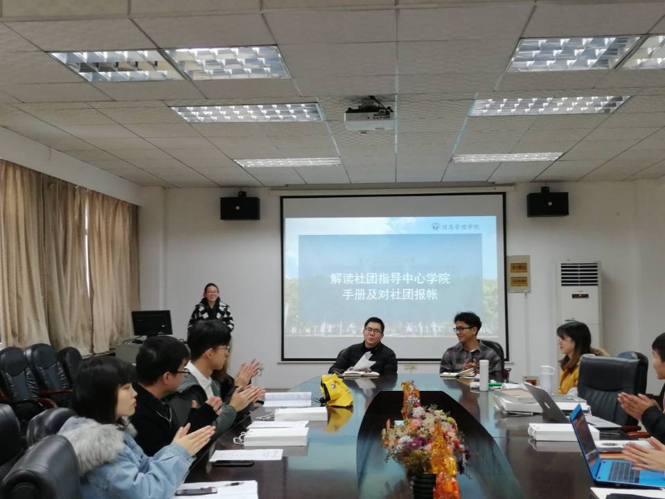 由于本学期校社联改名为学生社团指导中心,社团活动月总结、报账流程、官方qq推送格式、考评条例等方面有了一定程度上的改变,活动管理部部长李淼就社团指导中心学院工作手册进行了解读以及问题解答。