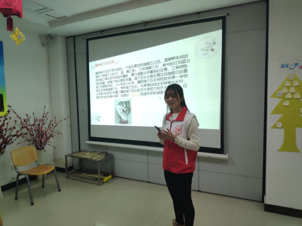 在介绍醴陵釉下五彩时,志愿者说道:“釉下五彩是特指清朝末宣统年间创烧的新品种。当时烧制的数量不多,现已属珍贵之物。醴陵釉下五彩中蕴含着中华工匠精神,它能让我们感受到文化的价值和创造的价值,所以我们要将这份非遗文化传承下去。”紧接着,志愿者便播放了醴陵釉下五彩制作过程视频,每一步精细化操作让所有残疾人朋友都露