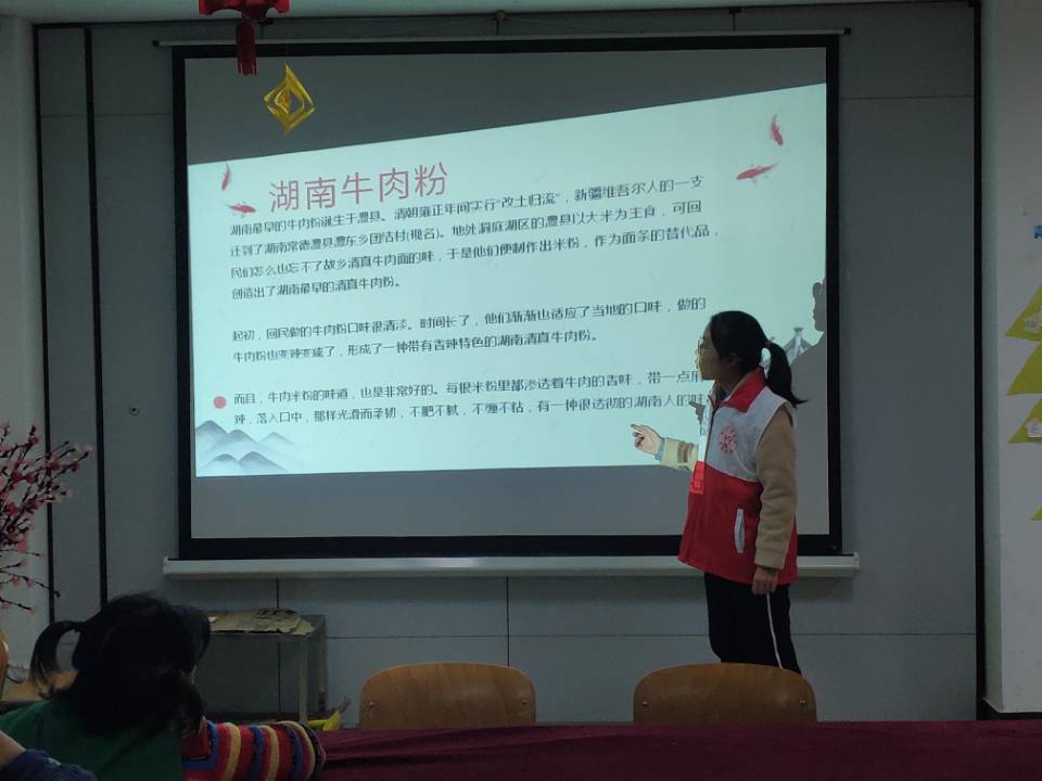 志愿者到达中南路阳光家园,经过十分钟的准备后,以文字、图片加视频形式,来介绍湖南牛肉米粉和剁椒鱼头的由来和制作过程,作为此次志愿服务活动的开端。接着志愿者又播放了摆手舞的视频,配上那富有节奏的音乐,以至于残疾人朋友坐在座位上便随着音乐舞动起来。接着有关舞火龙、醴陵釉下五彩、孟姜女的视频的播放,促进了残疾人朋友对湖南省非物质文化遗产相关知识的了解。