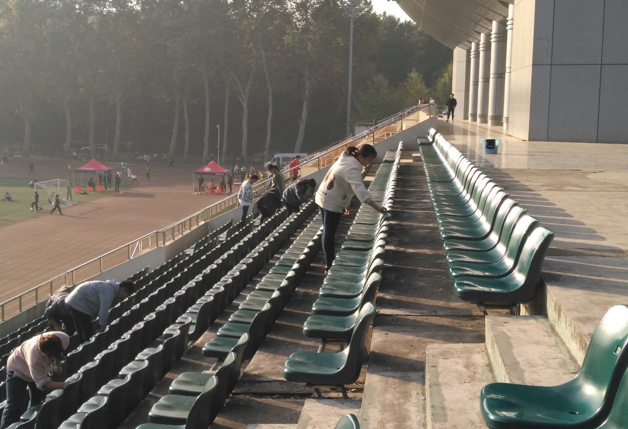 在志愿服务开始之前团支书就深入学习全国教育大会为切入点,动员同学们积极进行青年大学习的课程学习,以促进班风建设。接着分小组开展清扫佑铭体育场看台的志愿活动,同学们按照每小组划分的地区进行了认真的清扫,积极参与其中。