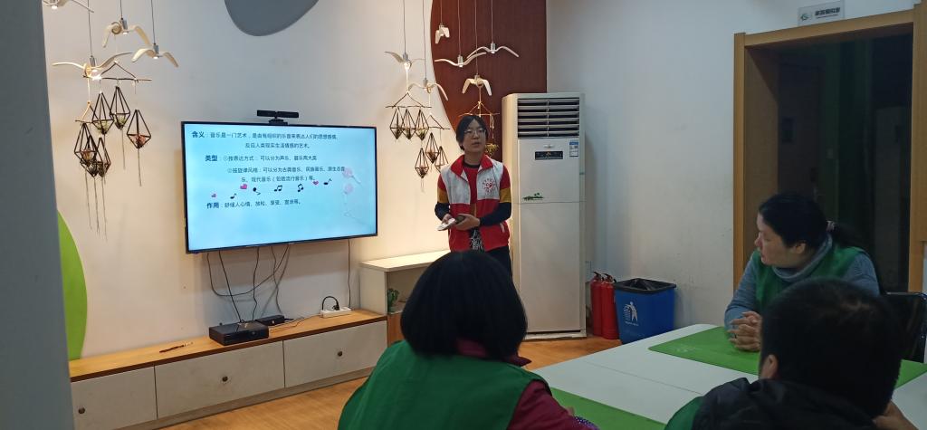 志愿活动开始后,首先由志愿者刘赛楠为残疾人朋友们介绍音乐的起源及分类。之后,由志愿者张文念来介绍相关的音乐常识,其中包括中国声乐常见的演唱方式、中国民族器乐演出形式及中国古代十大乐器等。讲解完毕后,志愿者笑着说道:“下面大家轮流来说一说你们知道的乐器吧。”当一位残疾人朋友用手比划着吹奏乐器时的样子,而嘴里却说不出乐器的名称时,志愿者在一旁低声提醒、启发着,最终所有人都顺利地说出来了自己知道的一件乐器。之后,志愿者在展示各类乐器的图片时,开玩笑地说道:“这个琵琶可不是吃的那个枇杷啊,它是种乐器。”现场气氛一下子活跃了起来。