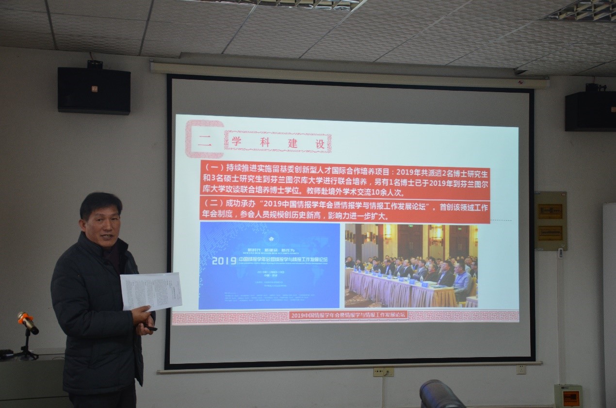 接下来,李玉海院长代表学院党政班子,作2019年度学院工作报告。院长首先从党建与管理、学科建设、教学工作、科研工作、学生工作、外事与留学工作、师资队伍建设等7个方面,回顾了学院一年来的主要工作。同时院长指出,学院虽取得了较好成绩,但从可持续发展角度来看,还存在科学发展方向不够凝练、社会服务能力继续提高、教辅队伍建设不足等问题,未来需进一步开展本科教学研讨、凝练学科特色方向、深化国际化办学、重视科研成果转化和加强校友联络。