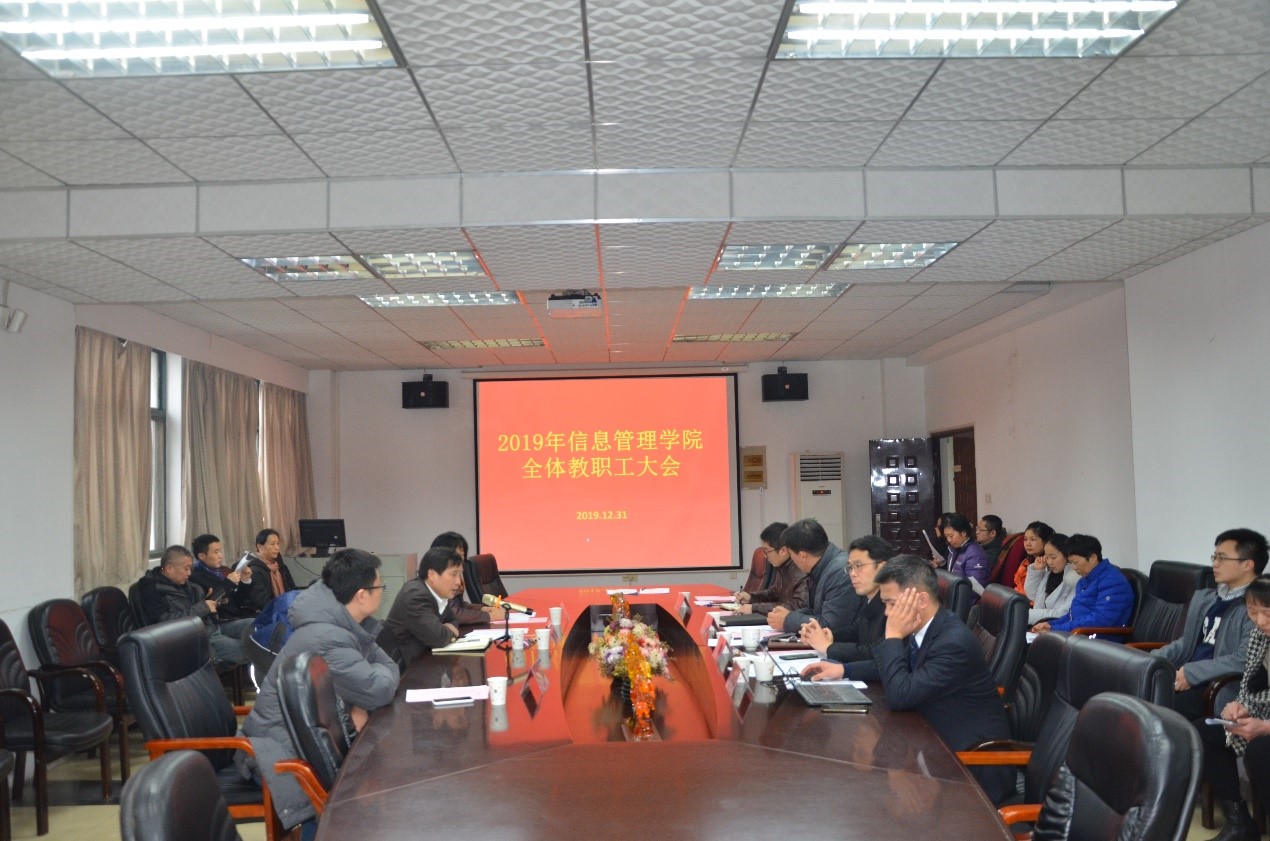2019年12月31日,由院工会组织的信息管理学院2019年度全体教职工大会在9号楼918顺利召开。副校长仁友州、校工会常务副主席郭春娥来院指导工作。院长李玉海、教学院长卢新元、科研院长曹高辉、工会主席胡潜等全院42名教职工参加了大会。会议由学院副书记王涛主持。