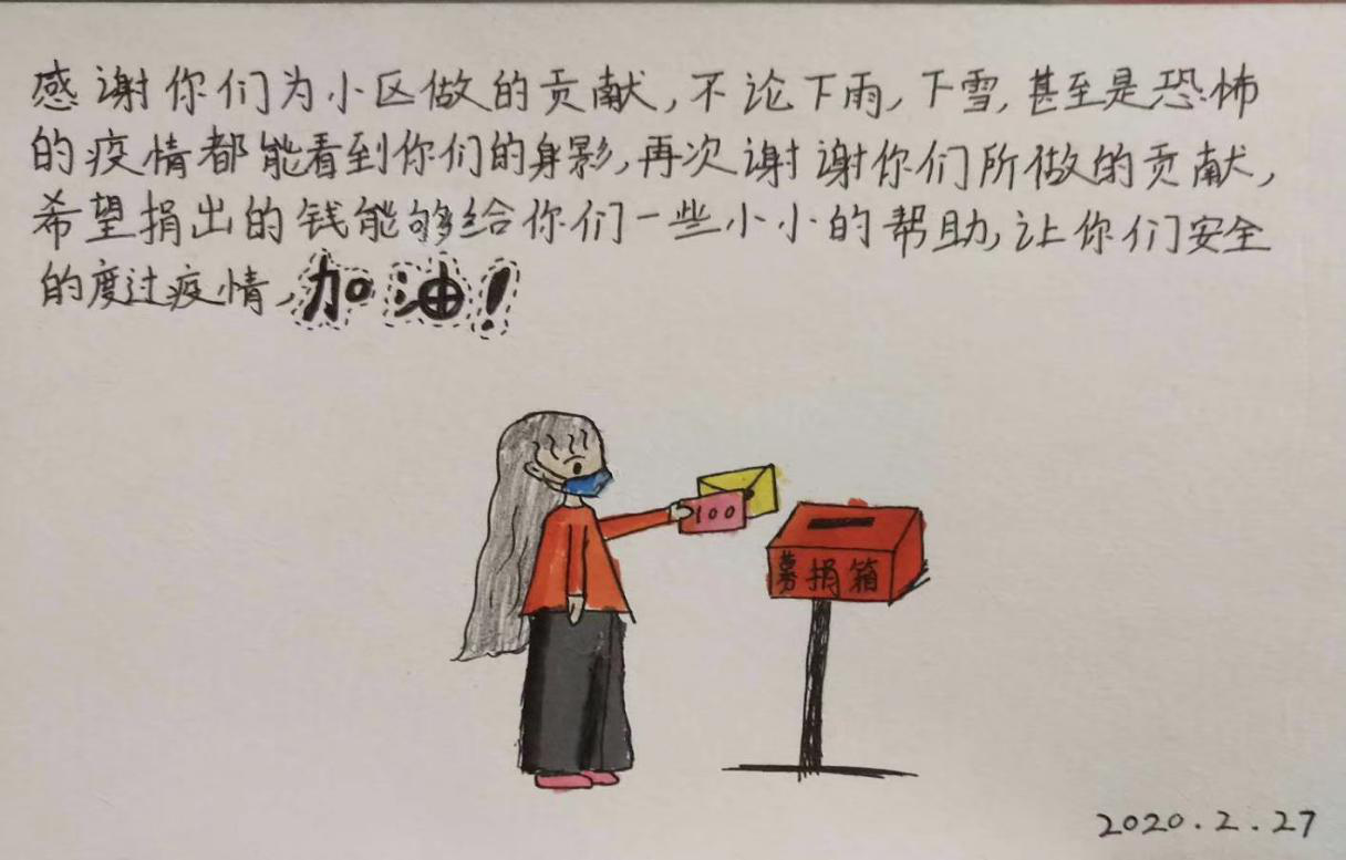 谈到志愿工作,刘井伟说道,我们作为志愿者,跟那些奋斗在一线的医务工作者和保障人员相比不值一提。尽管如此,我们也赢得了社区居民的赞誉,小区居民自发组织捐款支持社区抗疫工作,短短几个小时就募捐近万元。在这次志愿活动中令刘井伟印象最深刻的是一名社区的小朋友画了一幅画,为志愿者们暖心助力,感谢他们为社区所做的贡献。因此居民的理解与支持也是防疫工作能够顺利开展的坚强后盾。