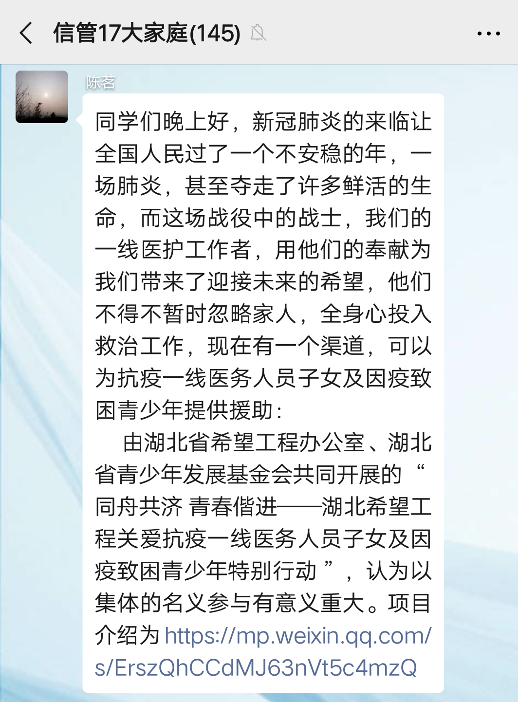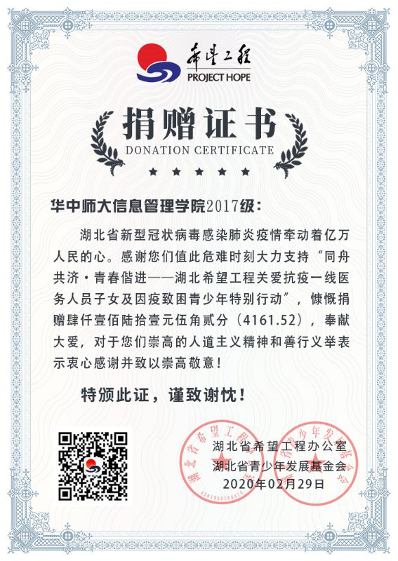 (通讯员 李乐平)突如其来的疫情,牵动着信管学子的心。2月28日,华中师范大学信息管理学院2017级全体成员在辅导员蒋可鸣老师带领下自发为湖北希望工程“关爱抗疫一线医务人员子女”和“关爱因疫致困青少年”项目捐款。