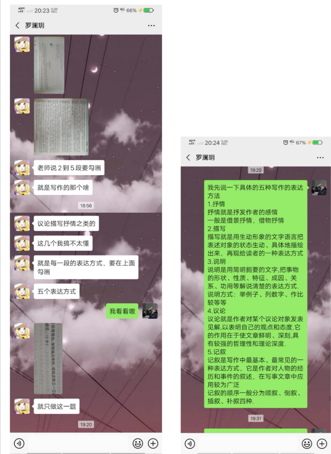 志愿者徐凤晨,帮助的是一名初一的女孩。孩子的母亲在武汉医院工作,无暇估计孩子的学业,希望可以得到志愿者们的帮助。母亲表示,孩子性格较为内向,可能不愿意与志愿者沟通。但是,在接触过程中,志愿者发现,孩子活泼开朗,踏实听话。愿意接受志愿者布置的其他习题,并认真完成。同时主动询问志愿者关于语文写作方法上的问题。