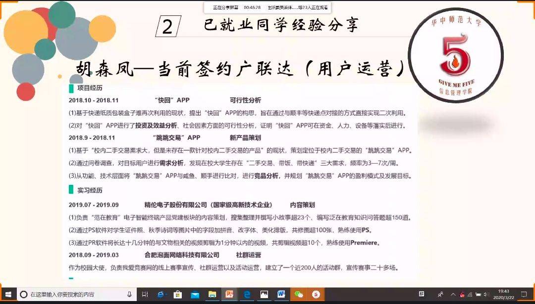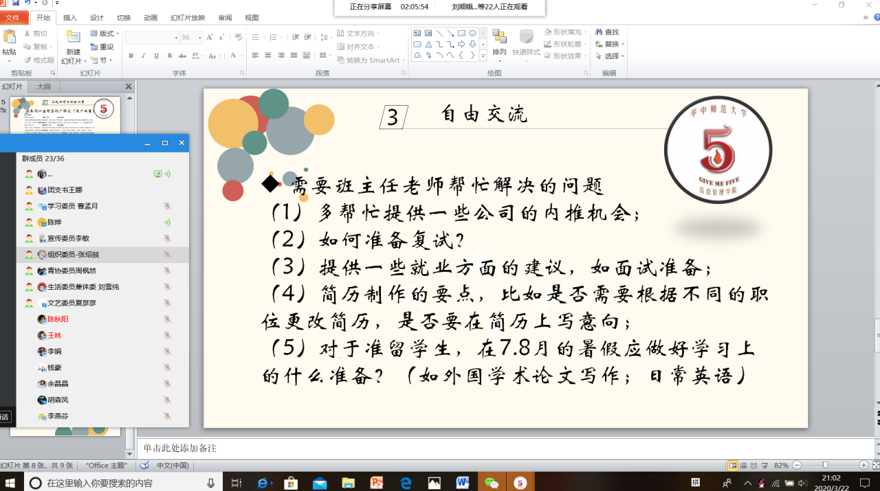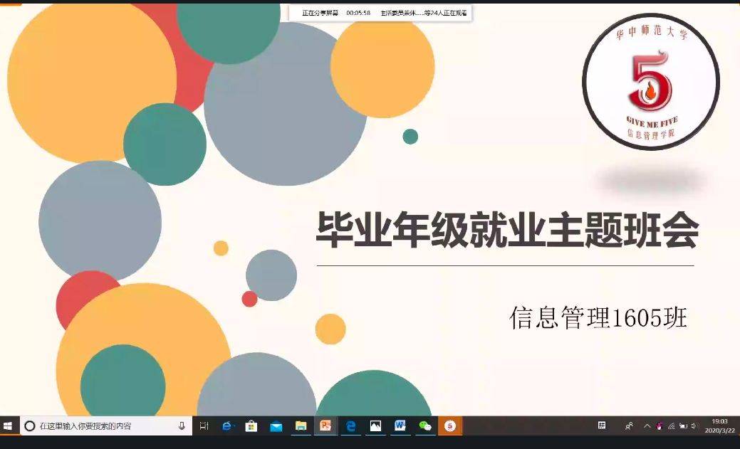 (通讯员 李敏)3月22日晚19点,信息管理学院1605班线上主题班会顺利举办。班主任陈烨老师就疫情期间同学的就业问题进行答疑解惑,并勉励同学们积极就业,增强信心。会议由1605班班长王妞妞主持,1605班全体学生参会。