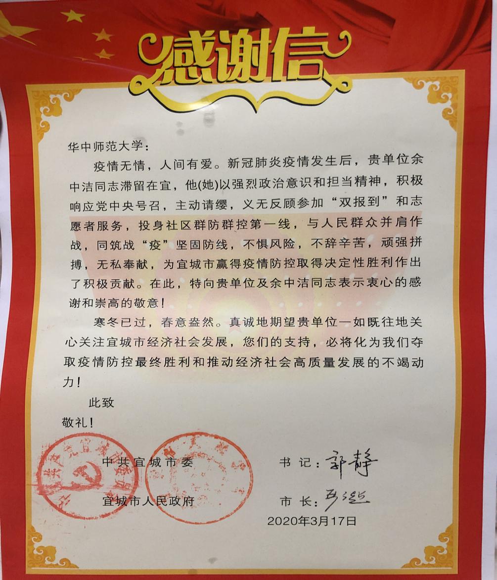 来自信息管理学院的余中洁,是18级情报学专业的一名在读研究生。二月上旬襄阳封城,全省各市之间不通往来,余中洁在得知疫情的严峻性后,不惧风险,积极响应党组织的号召,加入了抗疫防控的第一线,为家乡的疫情防控工作贡献自己的青春力量。她表示自己不但是一名华师的青年学生,同时还是一名入党积极分子,希望能够为家人和社会做些力所能及的事情。