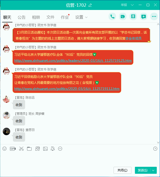 3月21日晚十点半,信管1702班团支书张学偲发布“学总书记回信,话青春担当”的线上主题团日活动。此次团日活动旨在深入学习贯彻习近平总书记给北京大学援鄂医疗队全体“90后”党员回信精神,凝聚众志成城抗击疫情的强大青春力量。