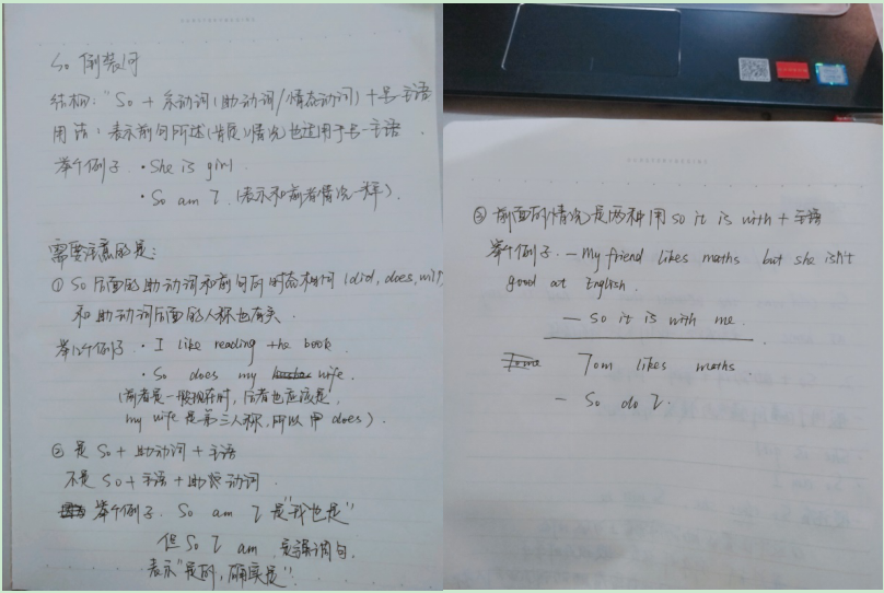志愿者徐凤晨辅导的是一名初一的学生小罗。小罗同学不像其他孩子那样腼腆羞涩,反而很容易亲近,也乐意与志愿者交流,这让志愿者倍感幸运。在坚持了一个多月的辅导之后,两人已经建立起了深厚的友谊。除了语文阅读和数学难题这种常规指导之外,志愿者又开始了英语作业的辅导。因为小罗的作业内容涉及未学习的知识,所以小罗做作业时遇到不少困难。针对这个问题,志愿者用了近3个小时的时间给小罗讲解so、neither的倒装句的结构、用法、习题等等。无论是志愿者发的语音、文字还是手写的内容,小罗同学都学得很认真。志愿者对此感到欣慰,她说:“无论花多久的时间准备这个语法讲解,无论花多长时间让她理解这个内容,只要她说‘小徐姐姐,我懂了’,我就很开心。”
