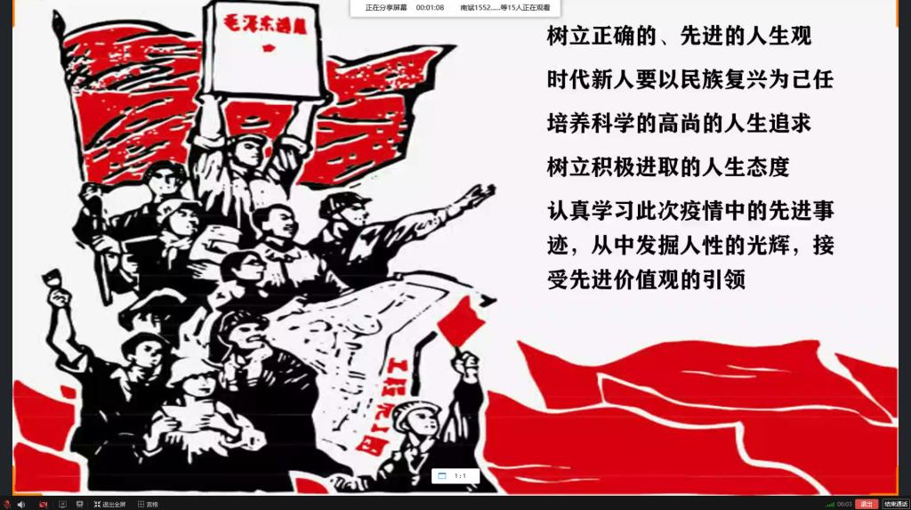 (通讯员 毛梦凡)3月22日下午14:00-15:00,信息管理学院1904班全体同学,在团支书李林沛的组织下开展线上团日活动。本次团日活动内容结合习总书记回信重要精神,围绕“对国家抗击疫情采取措施的认识”与“当代青年的价值观和责任担当”进行交流研讨,全班同学分小组准备,分享“抗击疫情——最令我感动的瞬间”任务或故事。