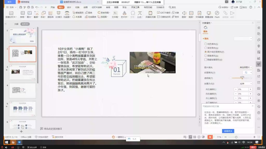 团日活动的第二个环节是分享疫情之中的感动故事。全体同学积极参与,向大家分享抗疫中的典型事例。在湖北出现物资紧缺等其他状况的时候,全国多地都能够伸出援助之手,各地的医院等也纷纷成立医疗队调往武汉,医务人员始终奋斗在疫情的第一线;俄罗斯朋友装满一飞机的物资火速驰援;巴基斯坦举全国之力帮助中国度过难关;日本友人送来写着“山川异域,风月同天”的物资。在同学们所分享的故事中,我们清晰地认识到习主席所提出的“人类命运共同体”概念,更加为抗疫中每一位的无私奉献所感动。