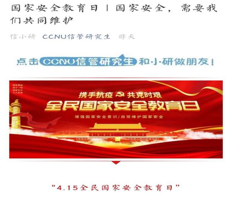 开展宣传活动,增强学习信念。“国家安全”与我们每个人的生活都有关,小到随口一句话、拍张照片、搜集网络公开的资料等等。为了增强学生对国家信息安全的学习意识,我院官方公众号“CCNU信管研究生”于4月15日推出了关于“4.15全民国家安全日”知识普及的推文,把主题宣传教育活动贯穿到日常思想政治教育工作中,引导同学们增强对相关内容的了解。
