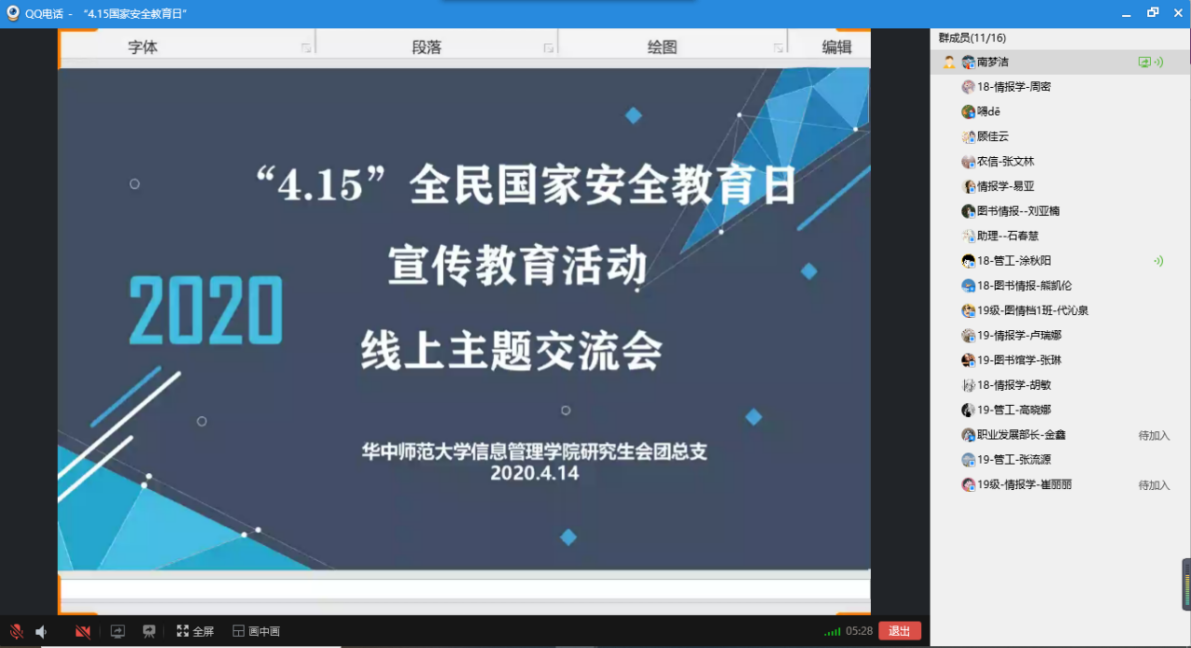 (通讯员 林晓晴)2020年4月15日是第五个全民国家安全教育日,本次全民国家安全教育日宣传教育活动主题为:“坚持总体国家安全观,统筹传统安全和非传统安全,为决胜全面建成小康社会提供坚强保障。”为进一步深入学习宣传贯彻总体国家安全观,引导研究生将总体国家安全观贯穿抗疫全过程,履行应对突发公共事件的职责义务,信息管理学院积极组织开展了“国家安全教育日”主题系列活动,并取得了良好成效。