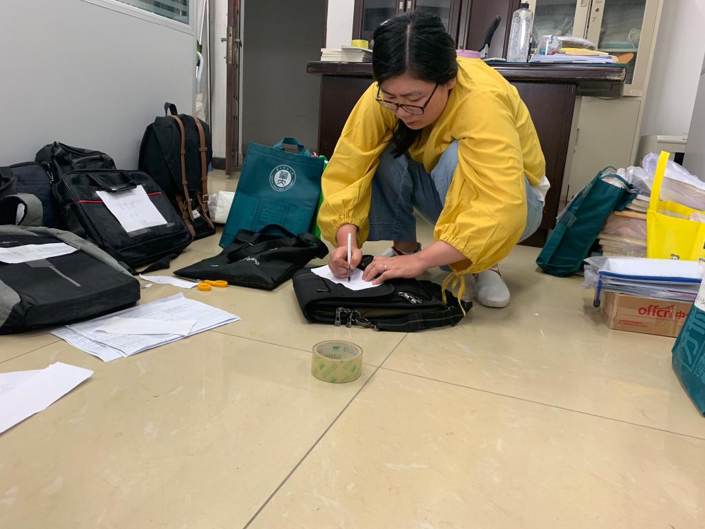 兢兢业业的“打包员”。分批分次的取货后,由于数量较大,涉及各年级学生的多种类物品,为确保安全,老师们将寄送物品统一运回信管学院学生工作办公室,进行初步打包。为防止遗失、错发、损坏等情况发生,分类、核对、初打包、贴标签等一系列流程,由各年级辅导员亲自完成。辅导员肖丽霞打趣地说:“我们这就是物流发货现场!”