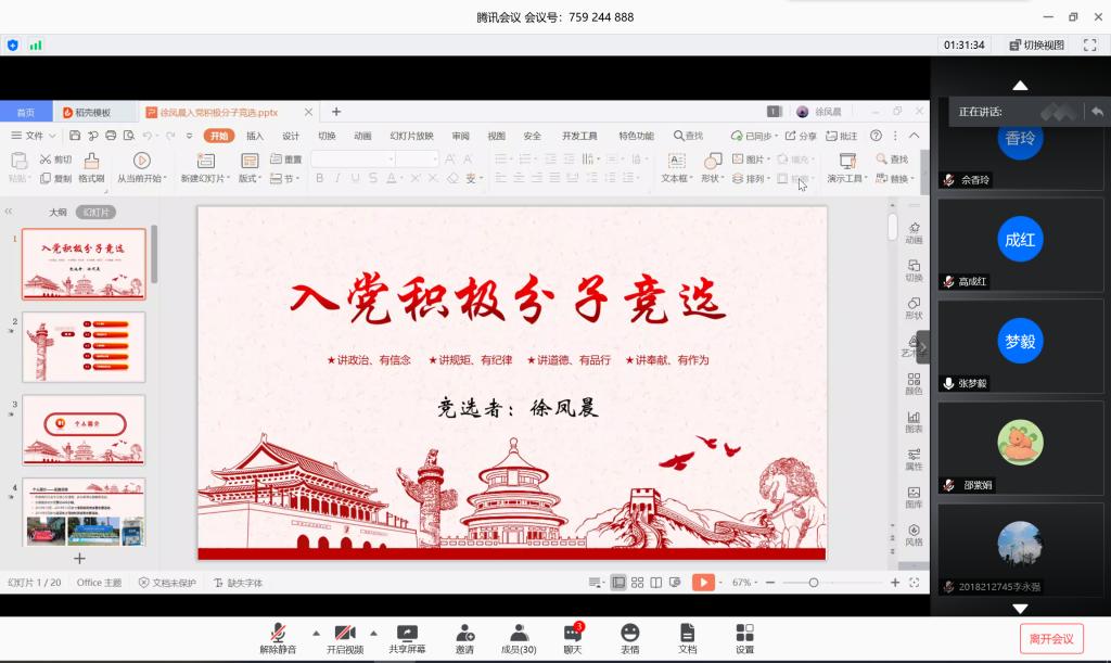 接下来1801班进行了入党积极分子竞选,参选人分别为隋东言、徐凤晨、张梦毅和洪缘,每位同学都以ppt的方式对自己学习、生活、工作三个方面进行了介绍。此次采取群投票的方式推选出两名入党积极分子,经过同学们的慎重选择,认真投票,最终投票结果为徐凤晨和张梦毅成为本次入党积极分子。