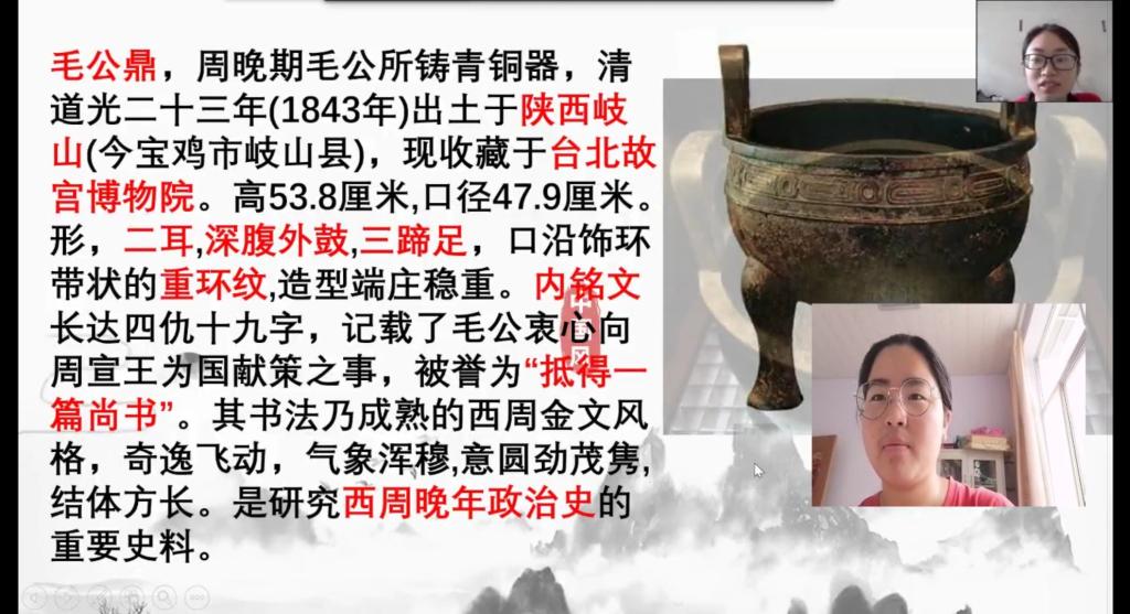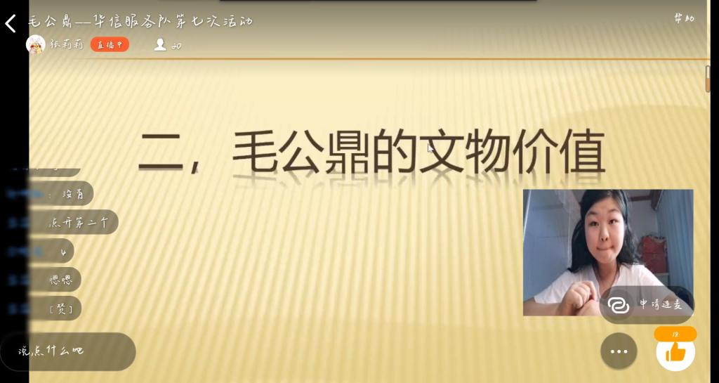 志愿者刘灿同残疾人朋友分享了毛公鼎在历史、文化、书法方面的价值,同时以视频的形式进一步深化了毛公鼎的文物价值。志愿者兰子银选择以不同人物动画图片配以相应通俗文字的形式介绍毛公鼎的历史流传过程。从毛公鼎的出土现世到毛公鼎的初次买卖再到毛公鼎的流传过程,残疾人朋友都听得不亦乐乎,纷纷在讨论区留言称赞。志愿者王林苑负责介绍毛公鼎的铭文和故事,志愿者王林苑在展示完毕毛公鼎的铭文内容后,对铭文的内容做了详细的介绍,并在最后阐述了毛公的有关历史记载。