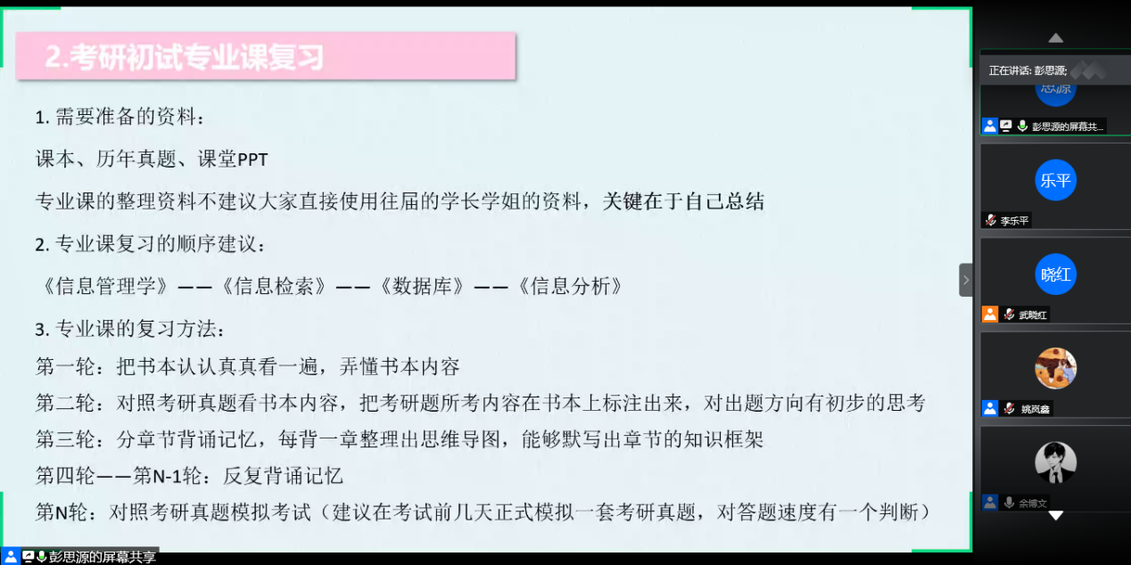 最后,以总成绩第一被我院情报学录取的彭思源学姐在分享中谈到,在备考过程中,要不断提升自己背诵记忆的能力,尽可能达到准确、全面、系统的程度,不错过每一个知识点。同时她还向同学们分析了面试的相关情况,总结了一些面试过程中可能出现的问题,和答题技巧。最后她强调了结伴学习的重要性,鼓励大家团结、合作学习。