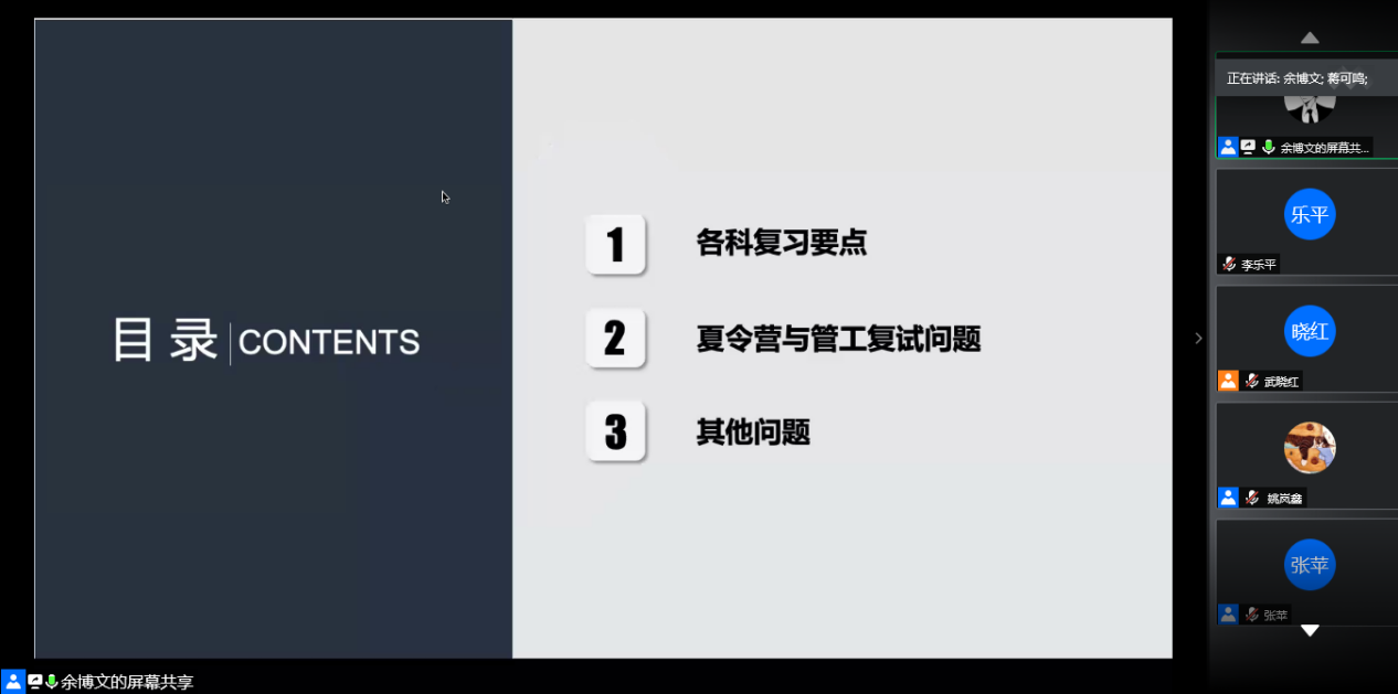 接下来,刚刚考取本校本院的余博文学长在向大家介绍了自己的复习之路后,重点分享了他在数学方面的备考心得,他说道,数学的几轮复习要循序渐进,不应随意跳过任何一个环节,并强调复习总结的重要性。学长的分享使同学们对备战数学方面的了解更加清晰深刻。